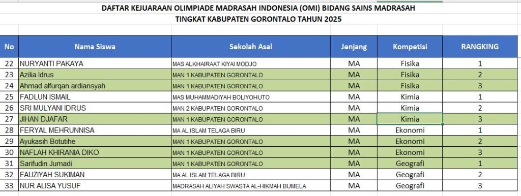 MARISAPA (man1kabgorontalo.sch.id) – Prestasi membanggakan kembali ditorehkan siswa-siswi Madrasah Aliyah Negeri (MAN) 1 Kabupaten Gorontalo (Kabgor). Pada pengumuman yang dirilis via online, Rabu malam (17/09/2025) sebanyak 9 siswa MAN 1 Kabgor berhasil dinyatakan lolos ke tingkat Provinsi dalam ajang Olimpiade Madrasah Indonesia (OMI) Sains Tahun 2025.